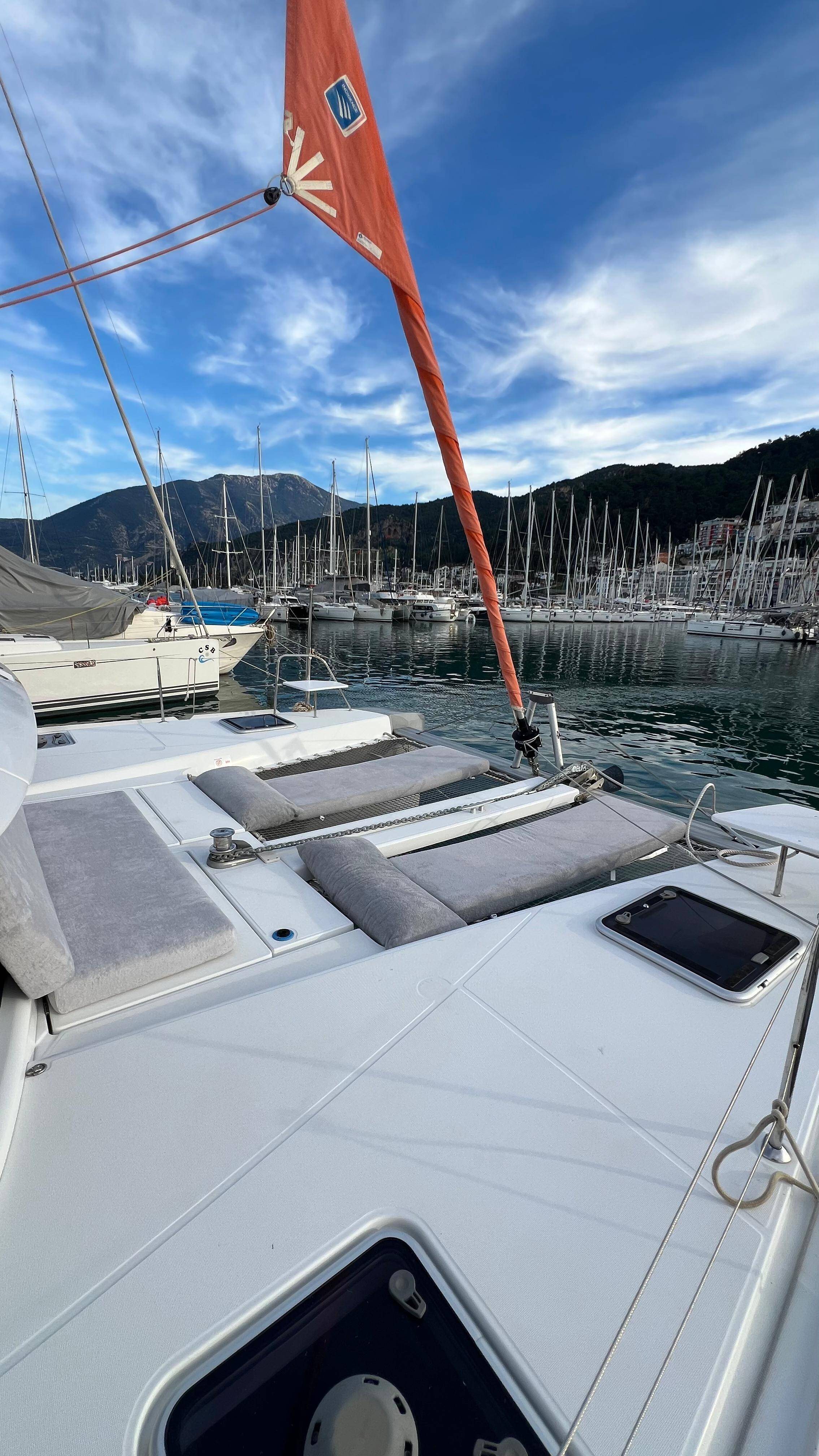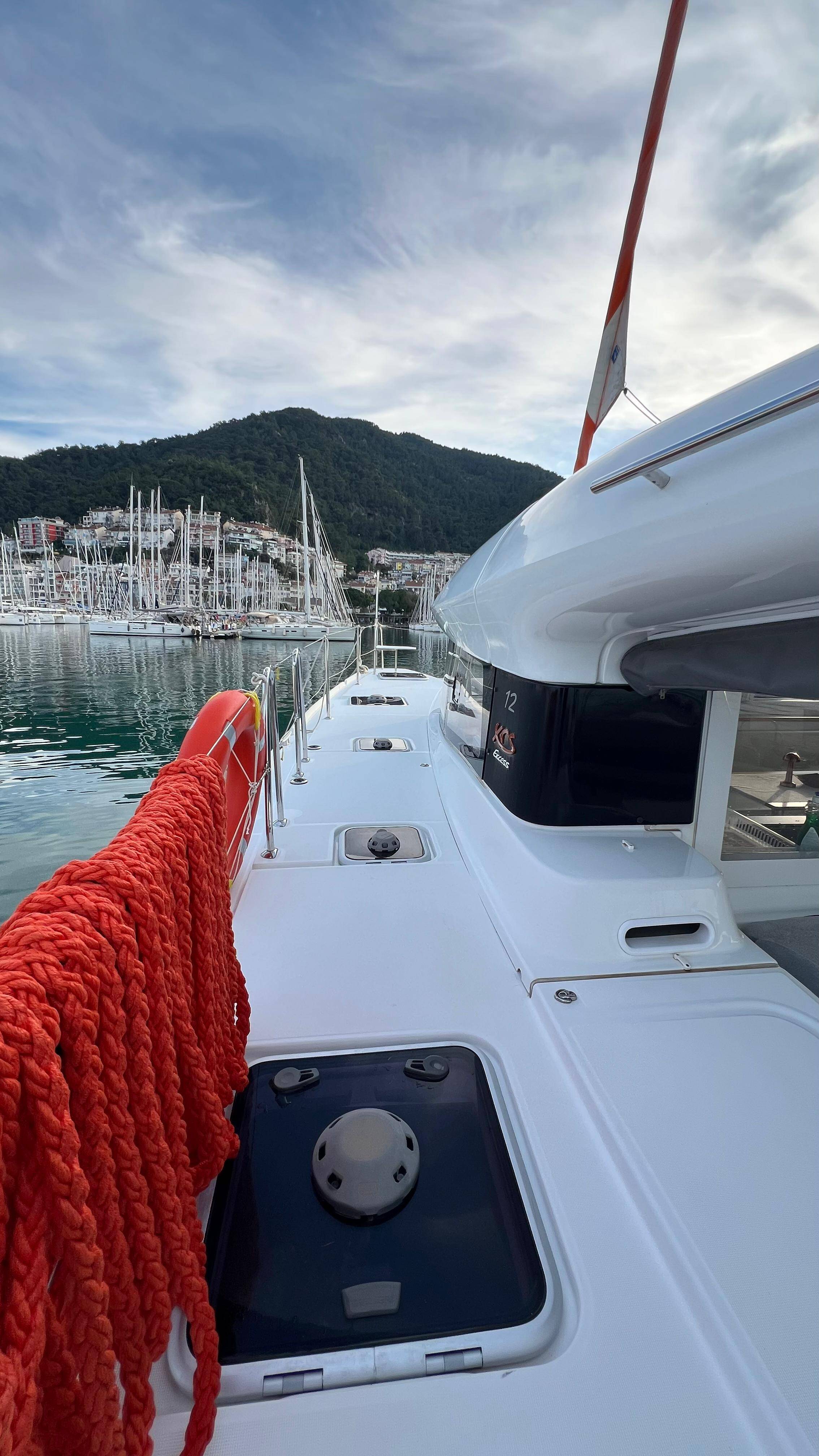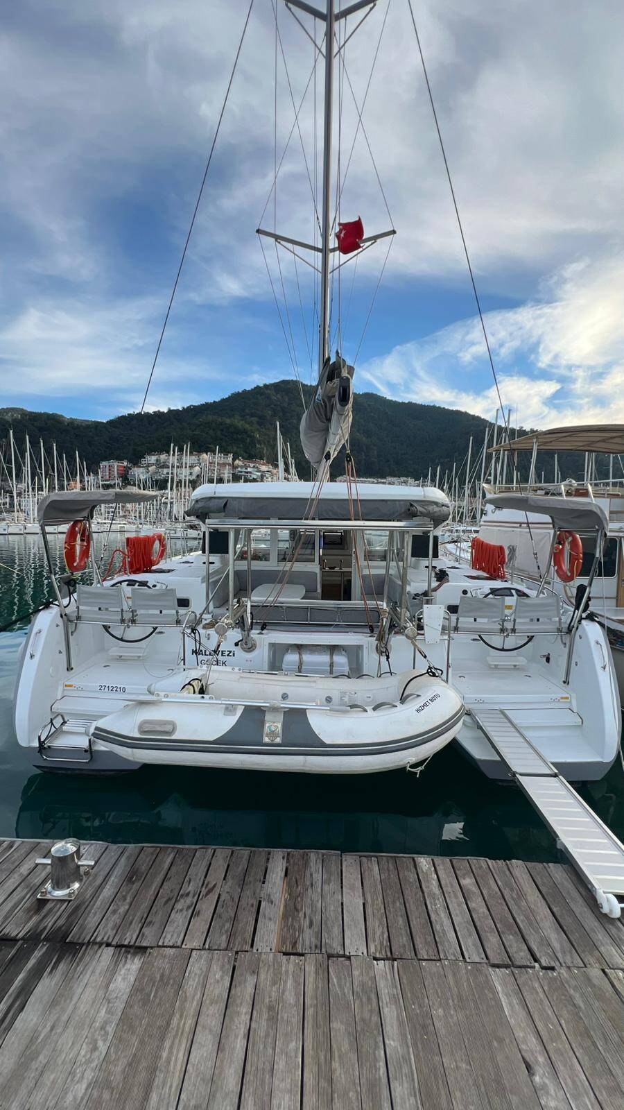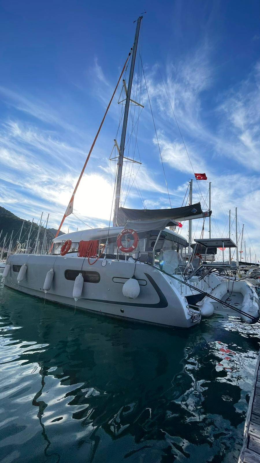 Catamaran Excess 12 Kalevezi, built in 2022 is anchored in the Fethiye, Ece Saray Marina Resort, Aegean, Turkey. It has 4 cabins, can accommodate 8 + 2 people and has 4 toilets.
