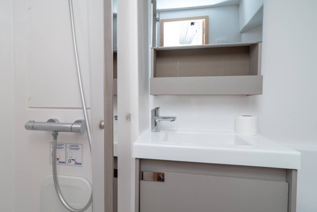 Catamaran Fountaine Pajot Aura 51 Ingrid, built in 2025 is anchored in the St. Martin, Simpson Bay Marina, St. Martin, Caribbean. It has 5 cabins, can accommodate 10 + 2 people and has 5 toilets.