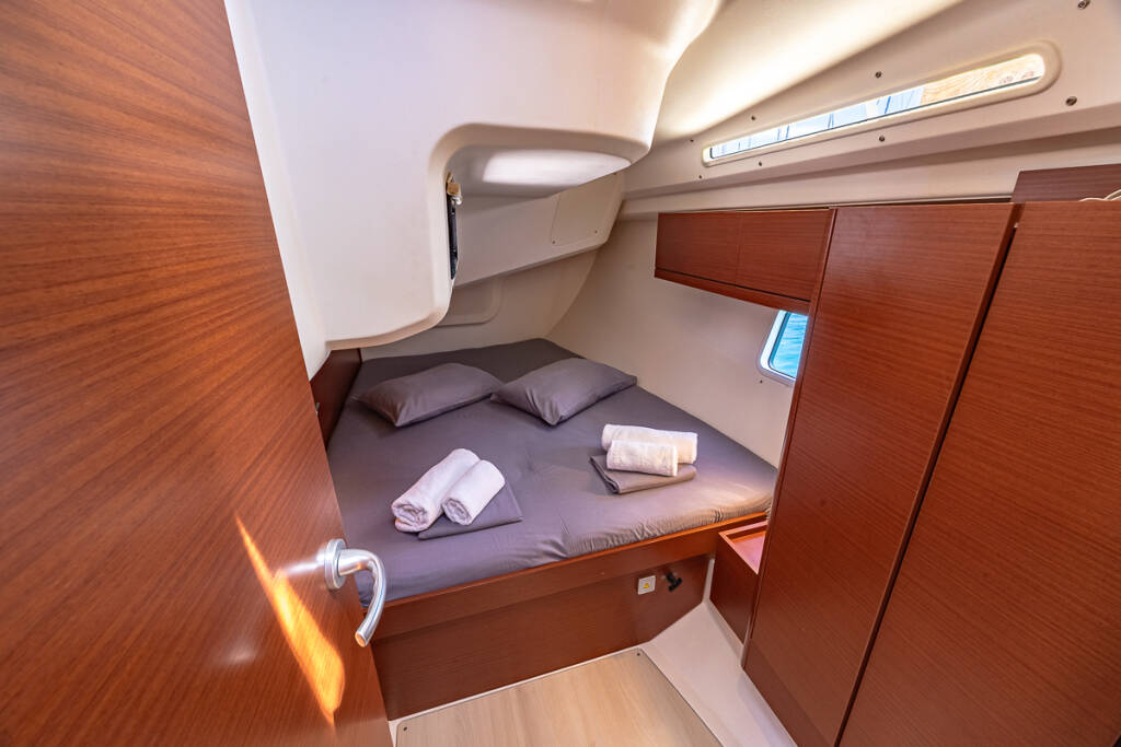 Sailing yacht Hanse 418 Dafne, built in 2022 is anchored in the Lefkas main port, Ionian Islands, Greece. It has 3 cabins, can accommodate 6 + 2 people and has 2 toilets.