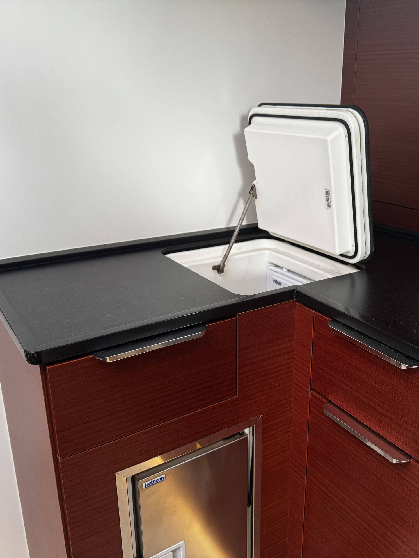 Flat keel, GRP steering wheels, 2 electric halyard winches, teak rub rail, composite bowsprit with integrated anchor and forestay fitting, genoa machines with pinstop for 105% furling genoa, additional fridge in panty, 12V fridge 135L, stainless steel cockpit tables with teak tops, 40L water boiler, covered halyards and plugs into cockpit, wet room with separate shower on bb. and stb, Forward cabins with double bed and separate bathrooms, Fusion multimedia radio with Wi-Fi and touchscreen for saloon and cockpit, Fusion subwoofer, 4 high-end 2-way speakers in saloon and cockpit, Fusion remote control in cockpit, Second B&G Zeus3 9" chartplotter at helm, Shower in cockpit (hot/cold water), Hatches for both aft cabins, Electr. anchor winch 1000W with fuse protection. Anchor winch 1000 W with circuit breaker and remote control, Center cleats, Footrests for helmsman, Helmsman seats, Flexiteak on cockpit floors + cockpit benches + bathing platform + helmsman seats bow and stern pulpit, Covered halyards into cockpit