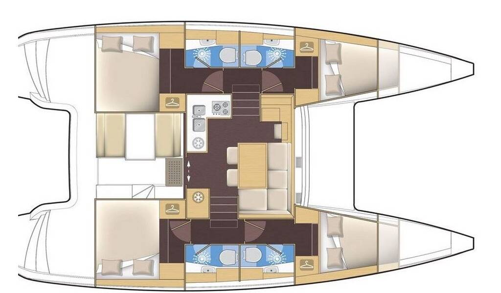 Catamaran Lagoon 39 Catanoo, built in 2014 is anchored in the Kos, Kos Marina, Dodecanese, Greece. It has 4 + 2 cabins, can accommodate 8 + 2 people and has 4 toilets.