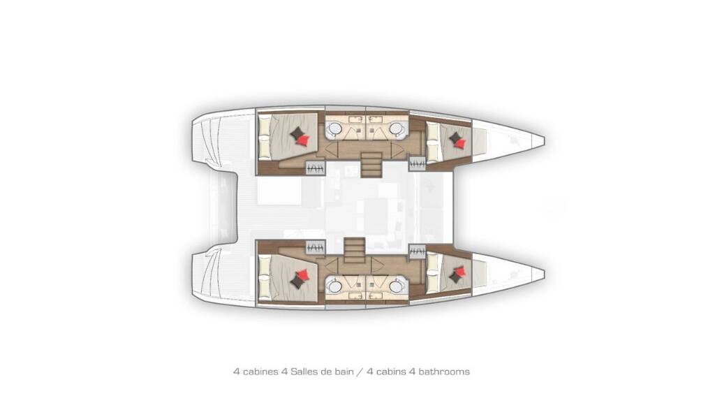 Catamaran Lagoon 40 Tom & Jerry, built in 2019 is anchored in the Sukosan, D-Marin Dalmacija Marina, Zadar region, Croatia. It has 4 + 2 cabins, can accommodate 8 + 2 + 2 people and has 4 toilets.