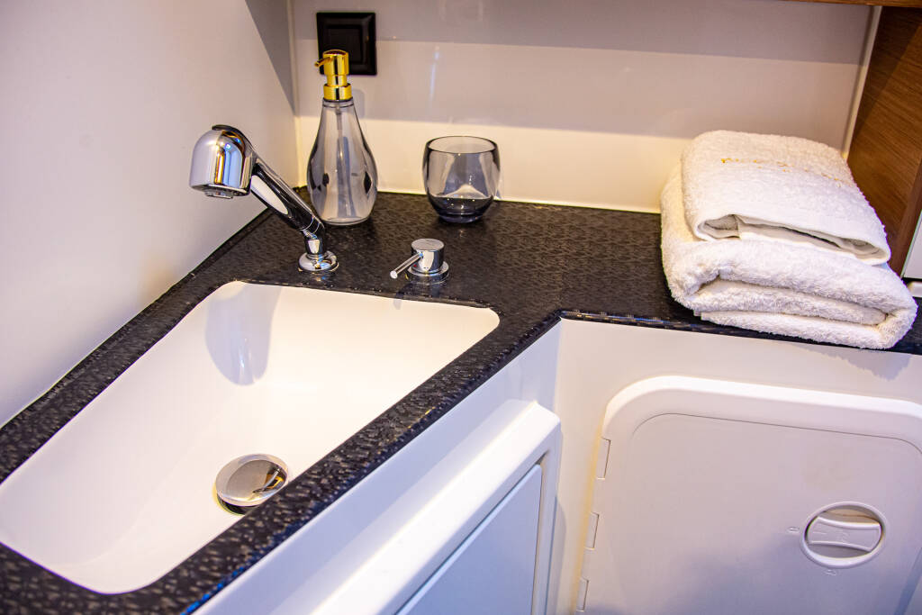 Catamaran Lagoon 42 Casta Diva, built in 2020 is anchored in the Preveza, Main Port, Ionian Islands, Greece. It has 4 + 2 cabins, can accommodate 8 + 2 + 2 people and has 4 toilets.
