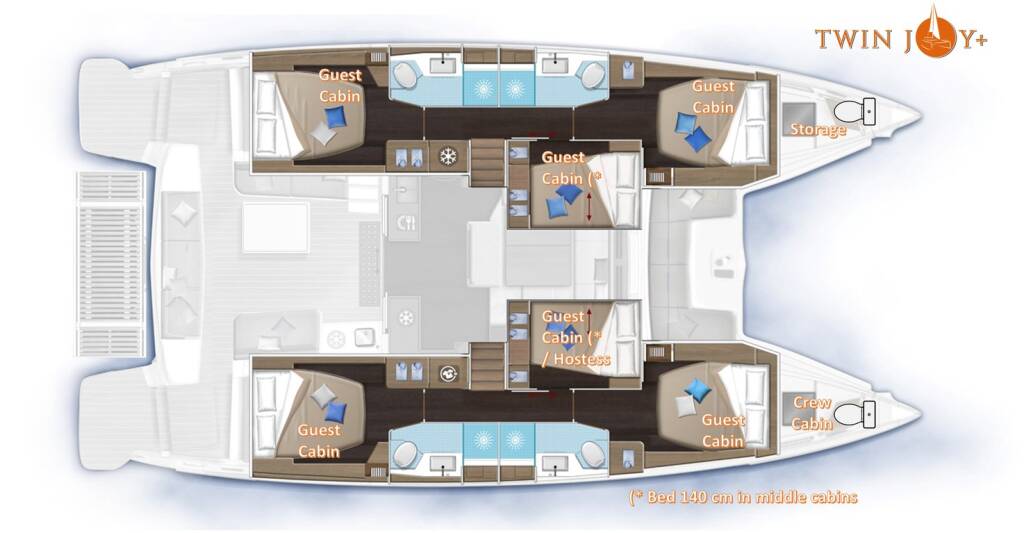 Catamaran Lagoon 51 Twin Joy +, built in 2024 is anchored in the Trogir, Marina Trogir (ex.SCT), Split region, Croatia. It has 6 + 1 cabins, can accommodate 11 + 1 people and has 4 + 2 toilets.