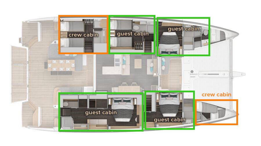 Catamaran Lagoon 60 Princess Karla, built in 2025 is anchored in the Marina Kastela, Split region, Croatia. It has 4 + 2 cabins, can accommodate 8 + 2 people and has 4 + 1 toilets.