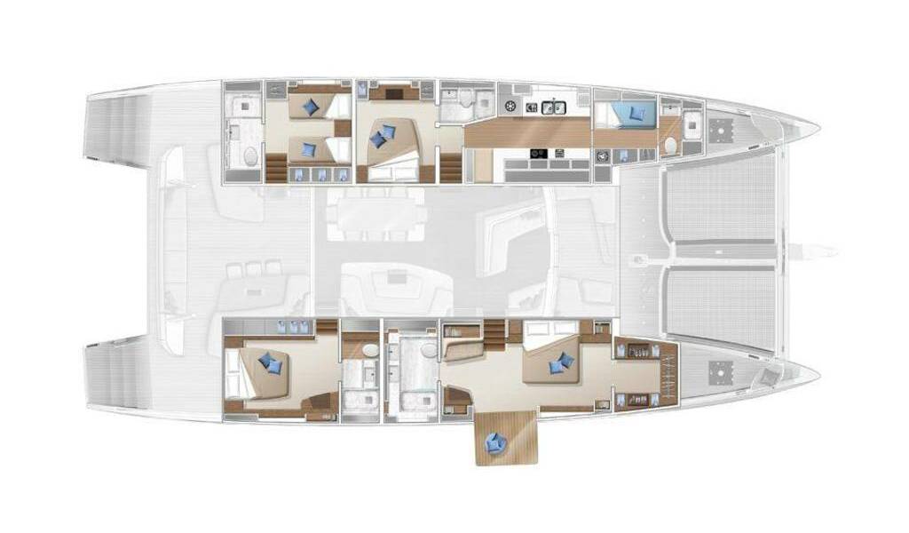 Catamaran Lagoon Seventy 7 La Desirade, built in 2024 is anchored in the Corsica, Ajaccio, Port Tino Rossi, Corsica, France. It has 4 cabins, can accommodate 8 people and has 7 toilets.