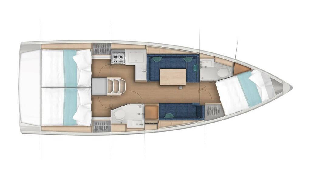 Sailing yacht Sun Odyssey 410 Wind Kiss, built in 2022 is anchored in the Dubrovnik, Komolac, ACI Marina Dubrovnik, Dubrovnik region, Croatia. It has 3 cabins, can accommodate 6 + 2 people and has 2 toilets.