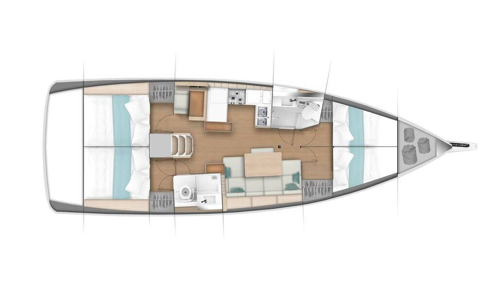 Sailing yacht Sun Odyssey 440 Trinity, built in 2023 is anchored in the Kas Marina, Mediterranean, Turkey. It has 4 cabins, can accommodate 8 people and has 2 toilets.